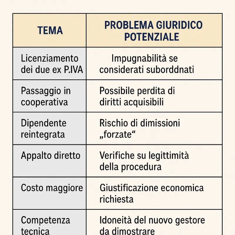 Se i due lavoratori in partita IVA venissero reimpiegati in cooperativa “dalla finestra”, sarebbe necessario individuare un terzo addetto per coprire i turni, aprendo un ulteriore fronte di discussione. Ma soprattutto: perché non stabilizzarli direttamente nella partecipata, dopo che un organo ispettivo li ha già considerati di fatto tali?