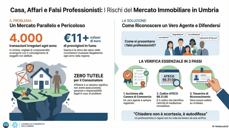 Comprare o vendere casa non è mai un atto neutro. Dietro una firma ci sono patrimoni, famiglie, risparmi di una vita. Eppure, proprio nel momento in cui la tutela dovrebbe essere massima, in Umbria prospera un mercato immobiliare parallelo fatto di falsi professionisti, operazioni fuori dalle regole e milioni di euro che sfuggono a controlli e garanzie. Le cifre raccontano un fenomeno strutturale, non marginale, che espone i cittadini a rischi concreti e spesso irreversibili.