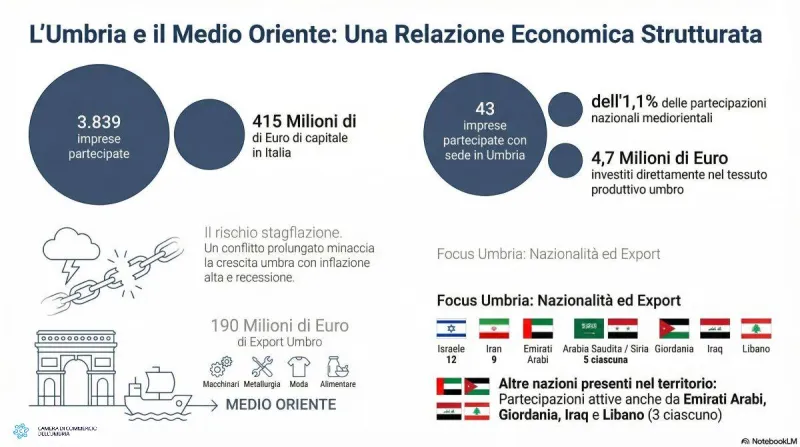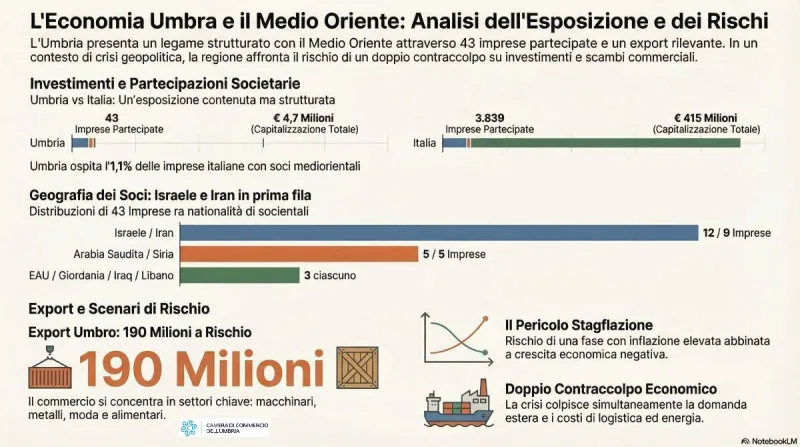 Sono 43, distribuite tra Israele, Iran, Arabia Saudita, Siria, Emirati, Giordania, Iraq e Libano. Valgono complessivamente 4,7 milioni di euro di capitalizzazione. E rappresentano il volto più concreto e meno raccontato di una guerra che dall’altra parte del Mediterraneo arriva dritta nei bilanci delle imprese umbre. A fotografare il legame strutturale tra l’Umbria e il Medio Oriente sono le elaborazioni di InfoCamere aggiornate al 31 dicembre 2025: 43 società partecipate da soci residenti nei Paesi del Golfo e dell’area mediorientale, un dato che rappresenta l’1,1% del totale nazionale. Una percentuale che non suona come un allarme, ma che nel mezzo di una crisi prolungata rischia di trasformarsi in un problema economico ben più ampio.