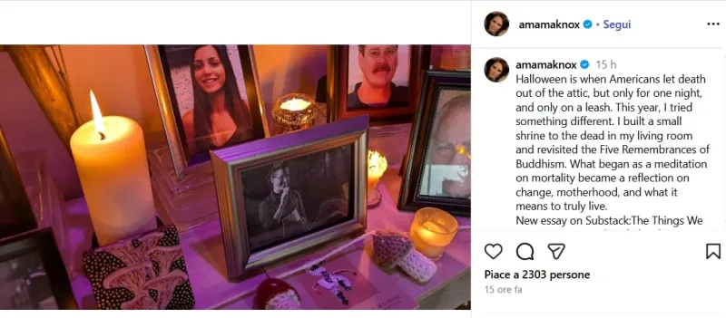 Come con la maglia del processo rispoleverata in una foto sui social, Amanda Knox torna a "provocare" sui social a proposito del delitto di Meredith Kercher. "Halloween - ha scritto Amanda Knox su Instagram - "è quando gli americani lasciano uscire la morte dalla soffitta, ma solo per una notte, e solo al guinzaglio. Quest'anno ho provato qualcosa di diverso. Ho costruito un piccolo santuario per i morti nel mio soggiorno e ho rivisto i cinque ricordi del buddismo. Quella che è iniziata come una meditazione sulla mortalità è diventata una riflessione sul cambiamento, sulla maternità e su cosa significa vivere veramente".