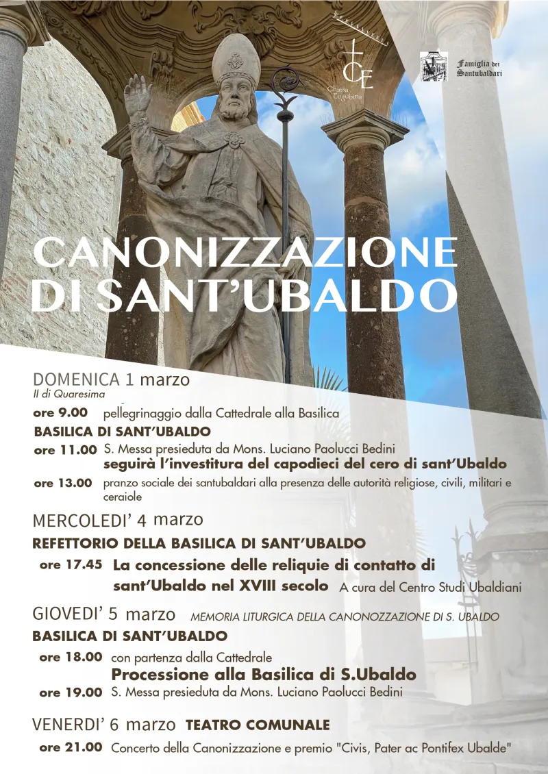 Il momento centrale delle celebrazioni sarà giovedì 5 marzo, data che ricorda la canonizzazione ufficiale del vescovo Ubaldo. Alle ore 18 partirà la processione dalla Cattedrale verso la Basilica, segno di una Chiesa che cammina nella storia custodendo la testimonianza del suo pastore.