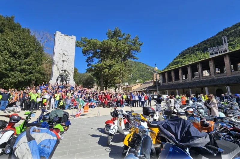 Uno dei momenti più significativi della giornata è stato l’arrivo alla Basilica di Sant’Ubaldo, dove i vespisti hanno ricevuto la tradizionale benedizione. Un gesto simbolico, che unisce la passione per le due ruote alla spiritualità e alla tradizione eugubina.