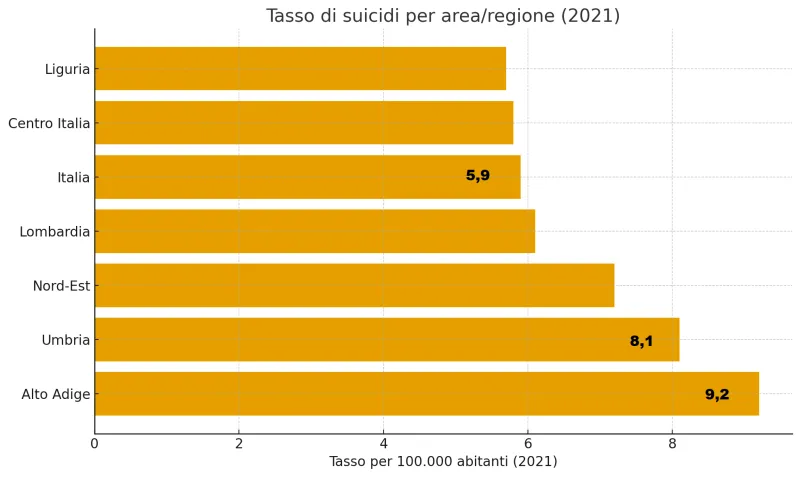 Secondo l’ISTAT, nel 2021 in Italia si sono registrati 3.792 suicidi, pari a 5,9 casi ogni 100.000 abitanti. Ma la media nazionale nasconde forti disuguaglianze.