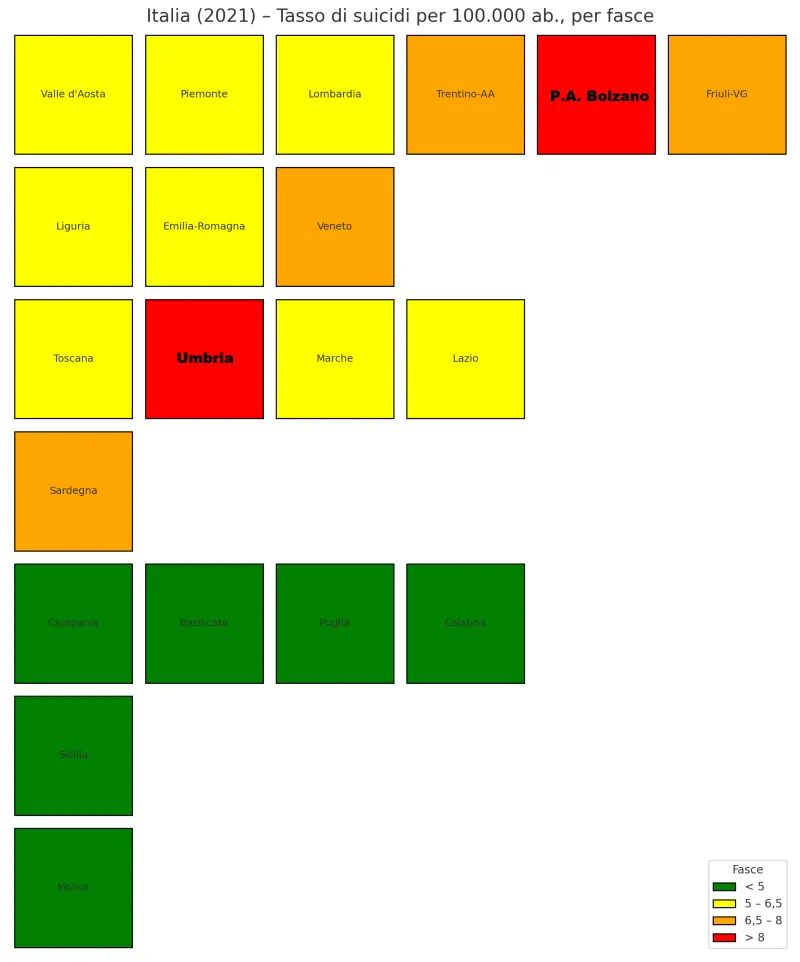 La mappa aggiornata dei tassi di suicidio in Italia (2021) mostra un quadro netto.