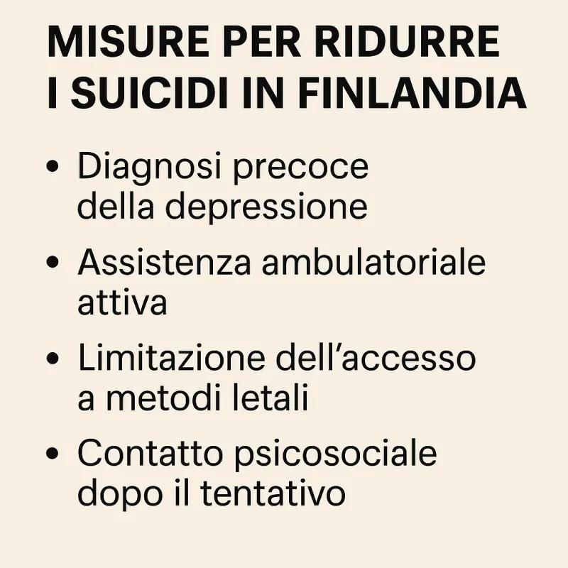 Negli anni Ottanta la Finlandia deteneva uno dei tassi più alti d’Europa — oltre 25 suicidi ogni 100.000 abitanti. Oggi, grazie a una strategia nazionale continuativa e basata su diagnosi precoce, assistenza psicologica diffusa e riduzione dei mezzi letali, il tasso è sceso sotto 13 per 100.000.
