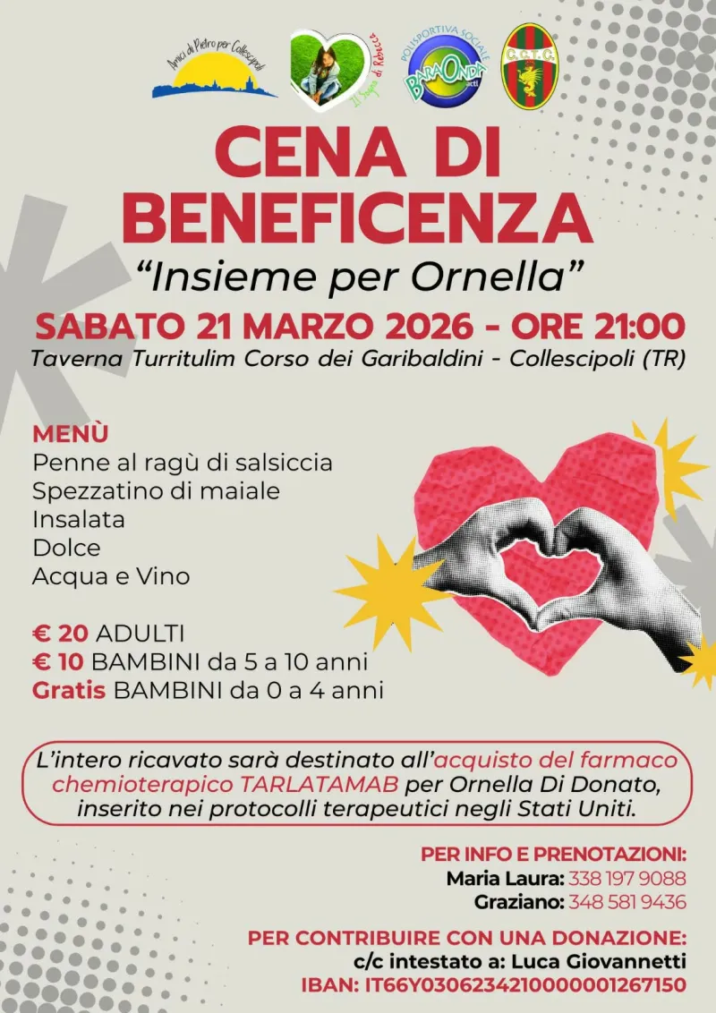 Una cena di beneficenza per aiutare Ornella, moglie del collega Luca Giovannetti. “Insieme per Ornella” verrà organizzata sabato prossimo (21 marzo ore 21) presso la Taverna Turritulim Corso dei Garibaldini di Collescipoli. Ornella, grande appassionata di sport e ternana d’adozione, sta combattendo contro un microcitoma o cancro polmonare a piccole cellule, al quarto stadio. Dopo aver effettuato già 2 cicli di chemioterapia risultati inefficaci, per allungare la sua aspettativa di vita c’è la possibilità di utilizzare un nuovo farmaco: il Tarlatamab. Questo medicinale viene infatti usato negli USA come protocollo standard nella cura oncologica, in Italia invece, solo sei ospedali lo utilizzano in fase sperimentale dopo il secondo ciclo di chemio per pazienti recidivanti, con la somministrazione che è a numero chiuso e limitato.