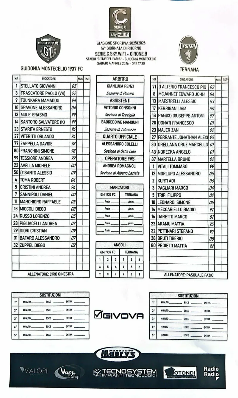 GUIDONIA MONTECELIO (4-3-3): Stellato; Viteritti, Mulè, Zappella, Frascatore; Franchini, Santoro, Tessiore; Spavone, Tounkara, Starita. A disposizione: Avella, D'Isanto, Toma, Cristini, Sannipoli, Marchioro, Miccoli, Russo, Pigliacelli, Diori, Bafaro, Zuppel. Allenatore: Ginestra.