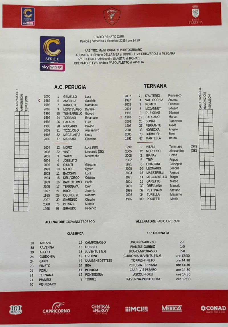 Perugia-Ternana sarà diretta da Mattia Drigo della sezione di Portogruaro, che sarà coadiuvato da Della Mea di Udine e Giulia Tempestilli di Roma 2. Quarto ufficiale Silvestri di Roma 1, mentre l'operatore FVS sarà Pasqualetto di Aprilia. Con Drigo il Grifo ha due precedenti, con altrettante vittorie: Perugia-Fermana 1-0 gol di Seghetti, disputata il 14 febbraio 2024 e Perugia-Torres 1-0 dell’11 marzo 2025. Con la Ternana ha invece un solo precedente: sconfitta a Campobasso (1-0) il 16 febbraio 2025.