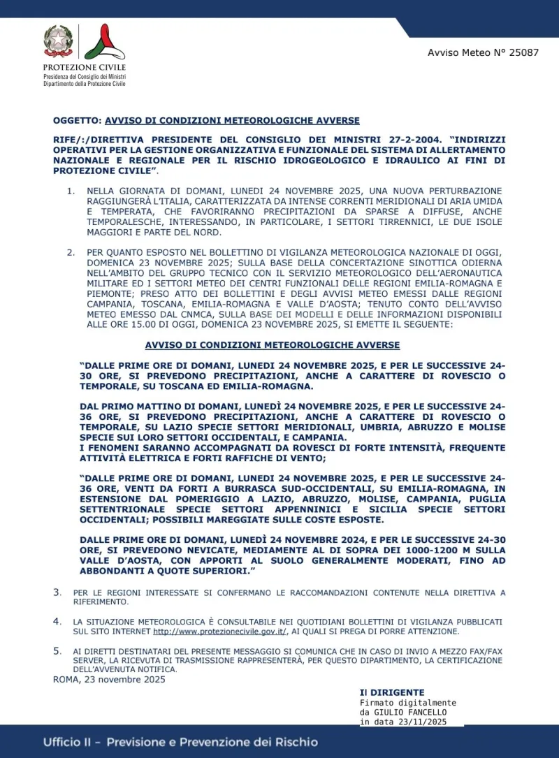 L'avviso specifica che sull'Umbria "dal primo mattino di lunedì 24 novembre 2025, e per le successive 24-36 ore, si prevedono precipitazioni anche a carattere di rovescio o temporale". Fenonemeni che "saranno accompagnati da rovesci di forte intensità, frequente attività elettrica e forti raffiche di vento".