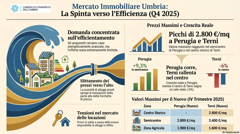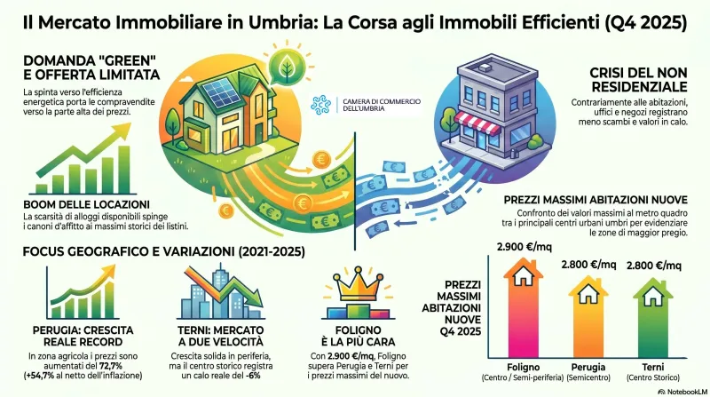 C’è un punto, nelle note di mercato della Borsa Immobiliare dell’Umbria, che spiega più di molti grafici la fase convulsa del residenziale regionale: “il mercato è proiettato verso l’acquisizione di abitazioni efficientate che non trova riscontro nell’offerta molto limitata del mercato di riferimento”. Una frase asciutta, quasi burocratica, ma che contiene già la tensione di un settore dove la distanza tra domanda e offerta diventa ogni giorno più larga. Il risultato, certificato dall’organo della Camera di Commercio per il quarto trimestre del 2025, è uno slittamento deciso delle compravendite verso la parte alta della forchetta dei prezzi. Non è più un’eccezione: è la regola. A spingere verso l’alto i valori immobiliari non è solo l’inflazione passata, ma una domanda che si concentra ossessivamente su due categorie merceologiche sempre più rare: gli alloggi in locazione e gli immobili nuovi o riqualificati in chiave energetica. Nel capoluogo, le punte massime toccano i 2.800 euro al metro quadrato in semicentro; a Terni, la stessa cifra si raggiunge nel centro storico, mentre il comparto non residenziale arranca con scambi in caduta libera e valori in discesa. Dal 2021 al 2025, al netto dell’inflazione, i prezzi reali a Perugia sono cresciuti tra il 27,3% e il 37,5%, con un balzo impressionante del +72,7% in zona agricola. Meno bene, invece, sulla sponda ternana: lì, nel cuore della città, il segno è negativo.