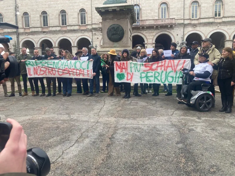 Il pullman è arrivato a Perugia attorno alle 10:20. I presenti si sono incamminati sotto Palazzo Donini, sede della Giunta regionale dell'Umbria, mostrando due striscioni "Riprendiamoci il nostro ospedale" e "Mai più schiavi di Perugia".