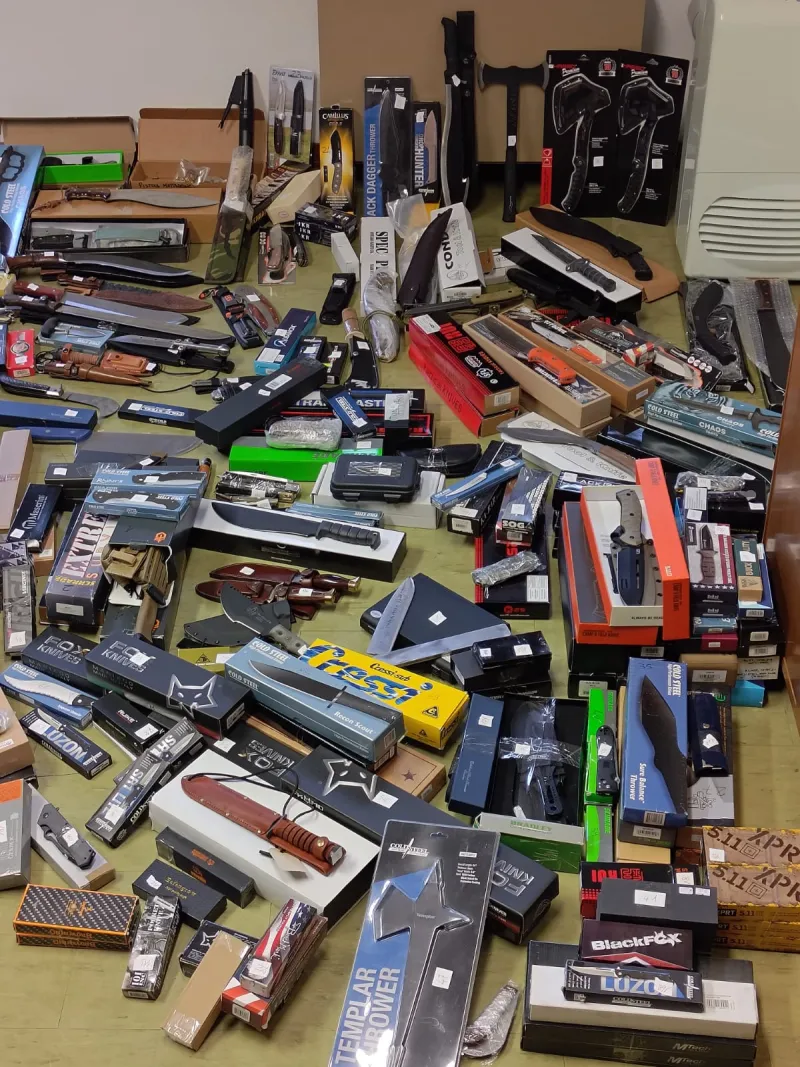 È stato dentro quelle stanze che l’indagine ha cambiato scala. Oltre ai telefoni, al portatile, al tablet e alla documentazione ritenuta utile, i militari si sono trovati davanti più di 240 armi bianche: katane, asce, coltelli di ogni dimensione, fino a un apparecchio da mattazione completo di munizionamento, un inventario da collezione oscura più che da casa privata. Alla fine di quella giornata, due uomini e una donna del posto sono stati denunciati in stato di libertà per detenzione abusiva di armi e per i reati legati allo sfruttamento della prostituzione, mentre l’intero materiale finiva sotto sequestro negli uffici della Procura.