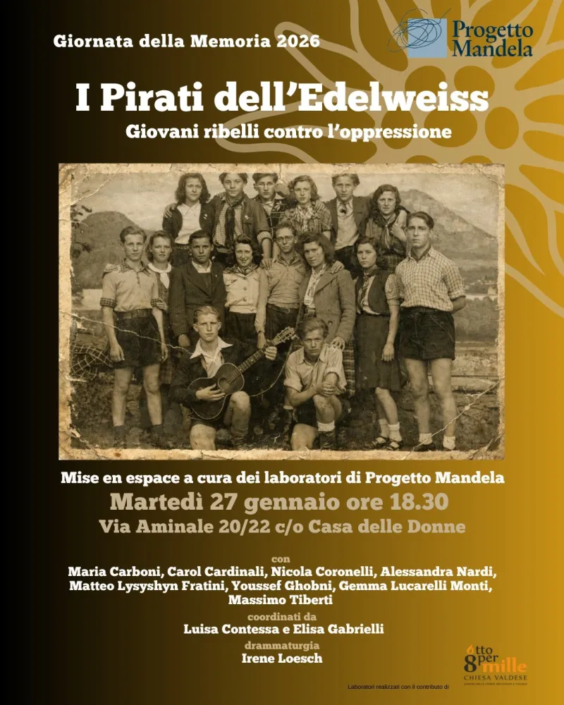 La memoria non è un monumento, ma un campo di allenamento per la coscienza. E il palcoscenico può diventare la palestra dove quegli muscoli etici, così facili ad atrofizzarsi, vengono esercitati dai più giovani. È questa la scommessa del Progetto Mandela di Terni che, in occasione del Giorno della Memoria, martedì 27 gennaio alle 18.30 alla Casa delle Donne (via Ludovico Aminale 20-22), presenta lo spettacolo “I Pirati dell’Edelweiss”. Una storia vera, poco raccontata, di ribellione giovanile al regime nazista, portata in scena dagli stessi ragazzi che hanno partecipato ai laboratori teatrali finanziati dai fondi 8x1000 della Chiesa Valdese.