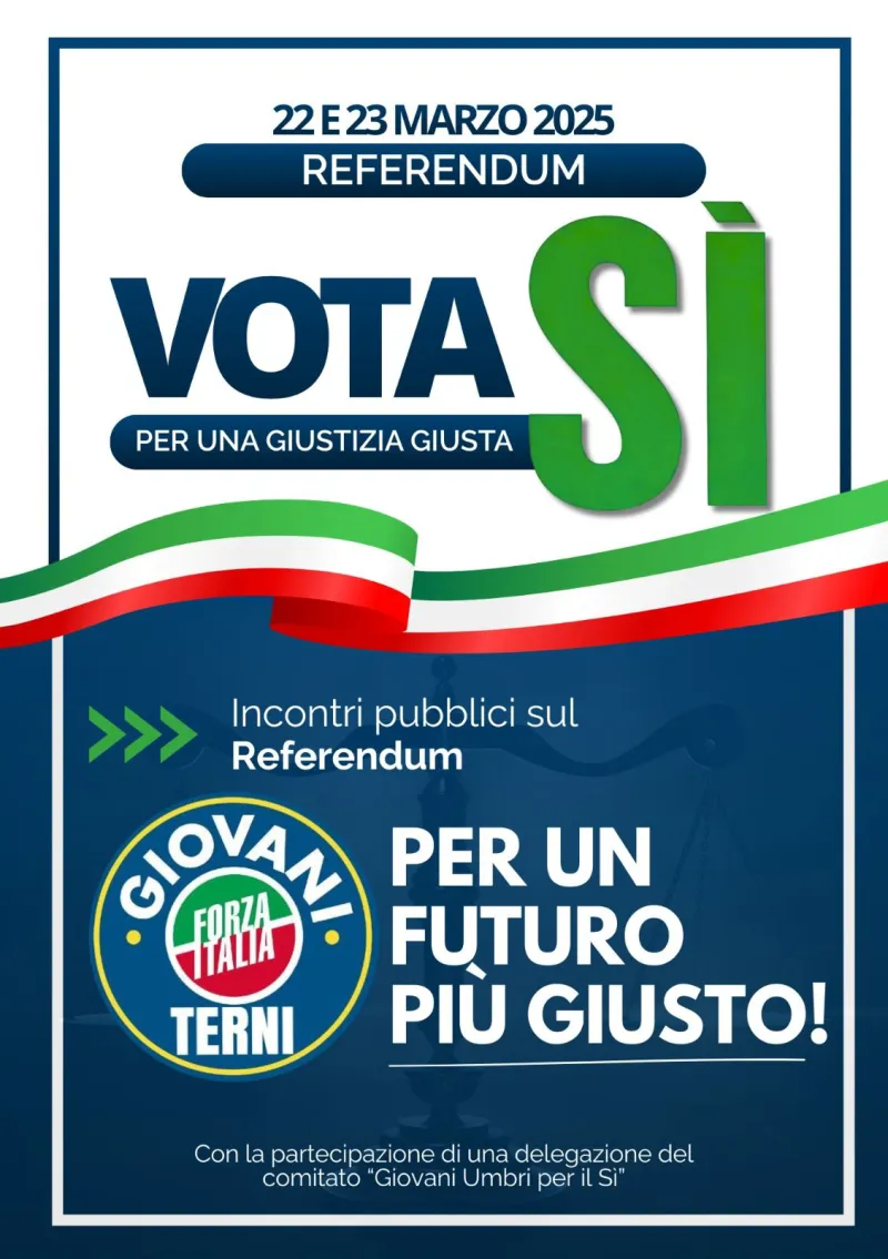 Sul fronte del sostegno al Sì, Forza Italia Giovani Terni ha organizzato una mobilitazione capillare sul territorio. Gli incontri non saranno semplici appuntamenti di volantinaggio, ma veri momenti di confronto con cittadini e giovani. La segreteria provinciale, insieme ai segretari comunali di Amelia, Sangemini e Terni, ha strutturato un calendario di iniziative che toccherà più punti della provincia: si comincia il 1 marzo a San Gemini, poi l’8 marzo ad Amelia, il 13 marzo a Narni, Mercato Narni Scalo, il 15 marzo a Terni, Corso Tacito, e si chiude il 18 marzo al Nuovo Mercato Coperto di Terni.