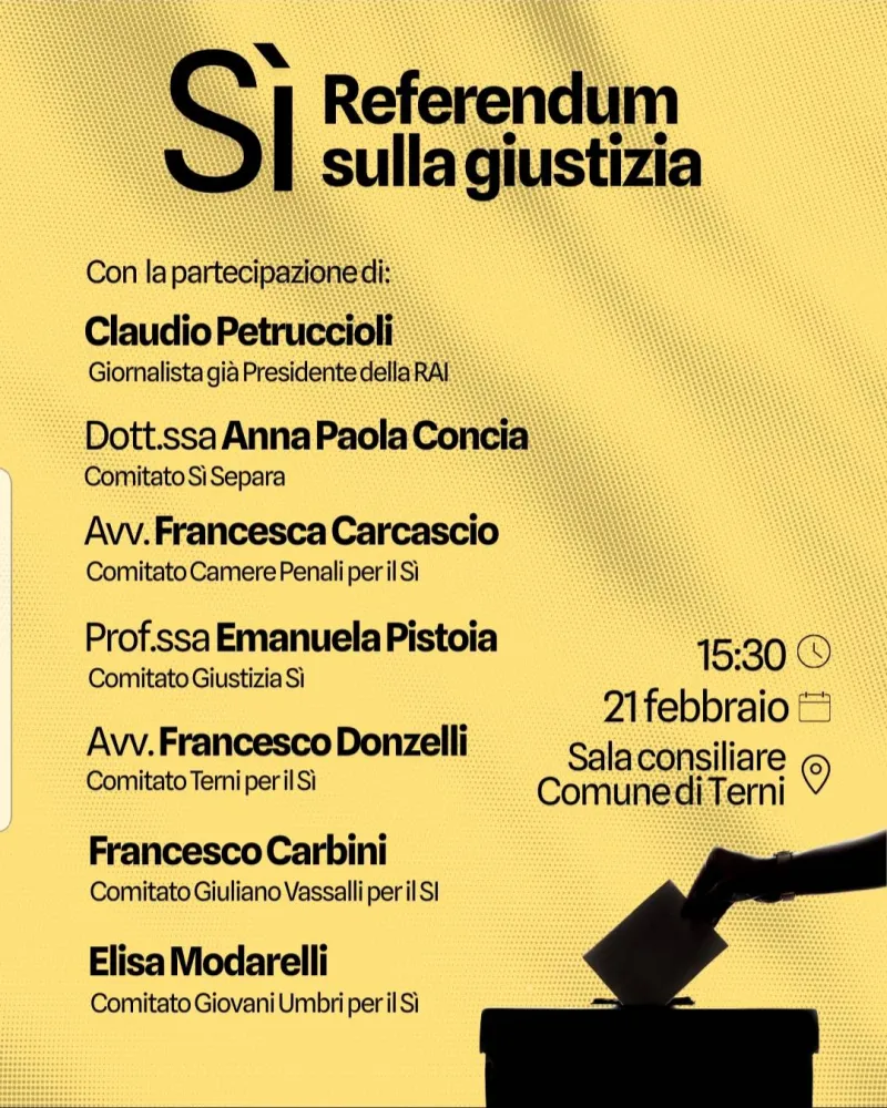 A intervenire, davanti a una platea attenta, una schiera di voci che il tema lo hanno studiato sui libri o toccato con mano nelle aule di tribunale: da Claudio Petruccioli, giornalista ed ex presidente Rai, alla costituzionalista Emanuela Pistoia; dall’ex deputata Anna Paola Concia, in collegamento da Francoforte, agli avvocati della Camera penale di Terni e dei comitati referendari locali. Il filo conduttore è uno solo: il referendum non è un attacco al governo, ma una “necessità sistemica”.