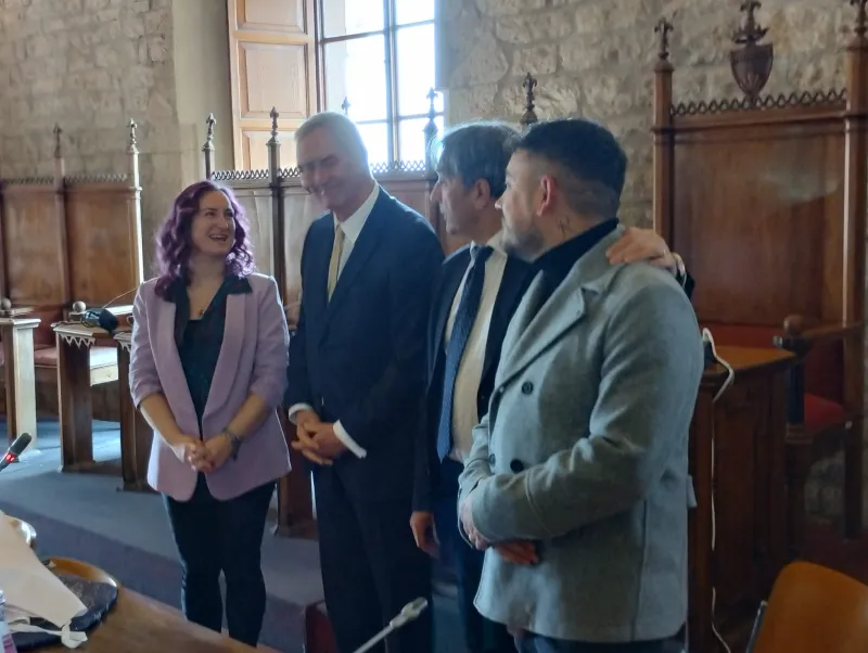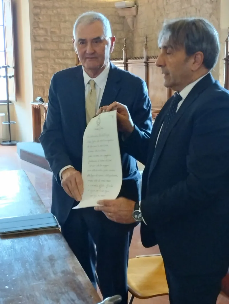 La visita si è conclusa con un momento particolarmente significativo, durante il quale il sindaco Fiorucci ha consegnato a Spogli una pergamena ufficiale e un piatto in ceramica, realizzato da giovani del territorio.