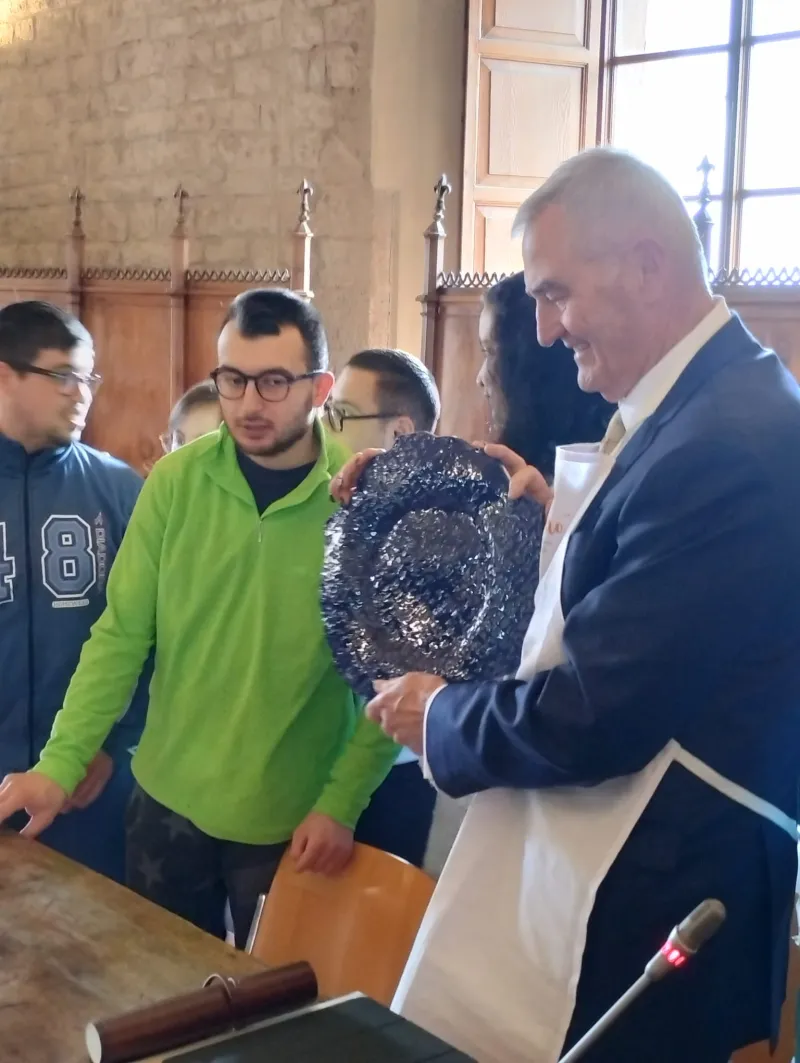Il dono del piatto in ceramica, decorato con richiami ai caratteri delle Tavole Eugubine, ha aggiunto un ulteriore elemento simbolico, legato alla storia e alla cultura della città.