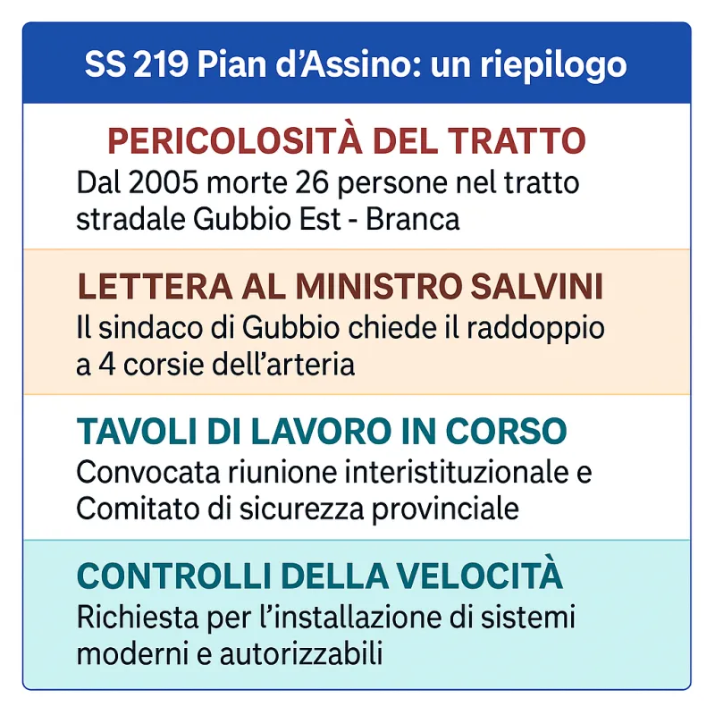 Il sindaco ha ribadito come il tratto Gubbio Est - Branca sia già noto al Ministero e ad ANAS, ma che a oggi manca ancora “un cronoprogramma operativo per la messa in sicurezza e il raddoppio a quattro corsie”. L’appello è chiaro: inserire l’opera tra gli interventi urgenti di rilevanza nazionale.