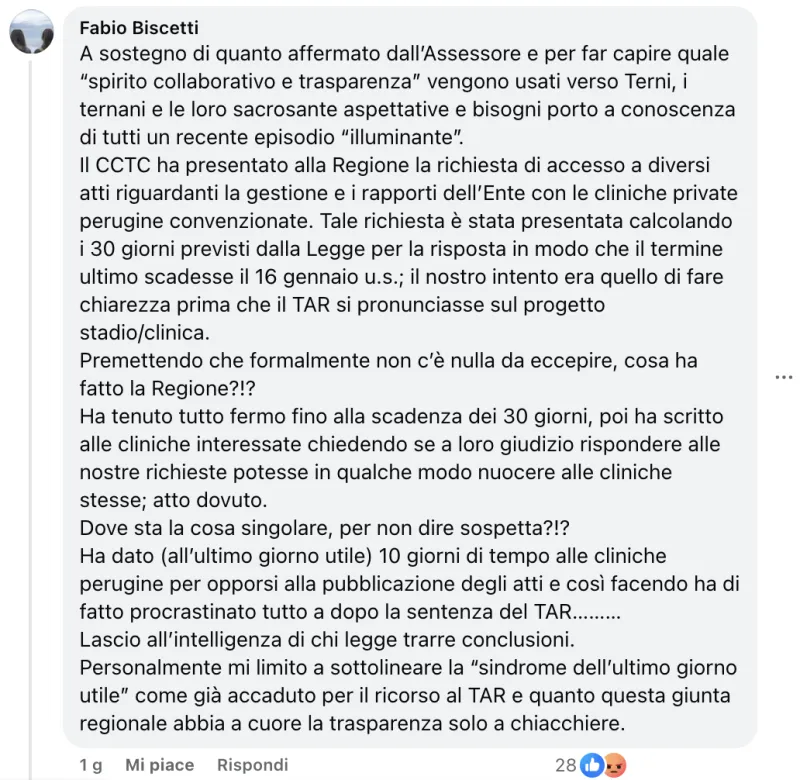 La notizia è stata ricostruita a caldo in un post Facebook dal vicepresidente del CCTC, Fabio Biscetti, che ha risposto ieri ad un altro messaggio di critica verso la Regione dell'Umbria da parte degli assessori comunali Schenardi e Iapadre. Qualche tifoso, commentando l'accaduto, ci ha pure scherzato sopra: "A Perugia hanno la sindrome dell'ultimo giorno...". Già, perché come nel caso del ricorso al TAR presentato dall'avvocatura regionale contro la "determina Giorgini", anche su questo atto gli uffici interpellati dai supporters rossoverdi avrebbero atteso l’ultimo giorno utile, dei trenta previsti dalla legge per muoversi, avviando solo allora il contraddittorio con le strutture sanitarie interessate.