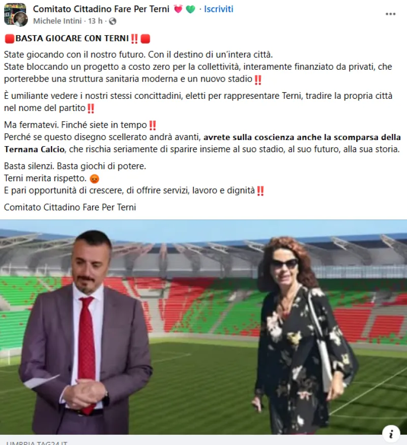 Il comunicato utilizza toni durissimi: “State giocando con il nostro futuro. Con il destino di un’intera città. State bloccando un progetto a costo zero per la collettività, che porterebbe una struttura sanitaria moderna e un nuovo stadio.” Il gruppo parla apertamente di umiliazione istituzionale, legata al comportamento dei rappresentanti regionali eletti a Terni: “È umiliante vedere i nostri stessi concittadini tradire la propria città nel nome del partito".