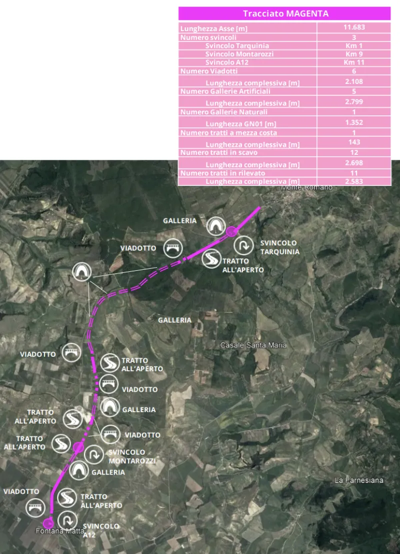 I cantieri, che nel cronoprogramma richiederanno almeno 5 anni di lavori. Il tracciato Magenta ha un costo preventivato di 433 milioni di euro in lavori e un investimento totale di 619 milioni. Il nuovo tratto stradale, lungo circa 11,7 km, si collega al primo stralcio dell'opera e include una serie di gallerie, una naturale e 5 artificiali, 6 viadotti e 3 svincoli.
