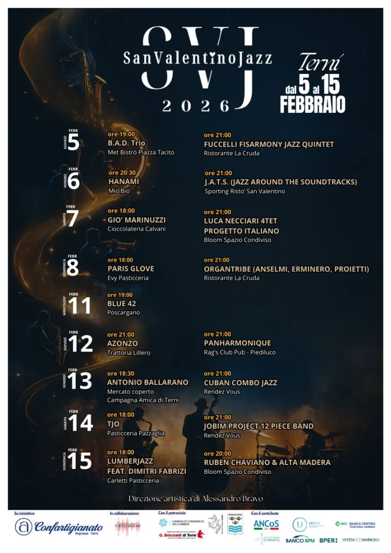 Una città che si anima con la musica che le scorre nel dna proprio nel periodo delle celebrazioni per il Santo patrono. A Terni sta per partire la 17esima edizione di San Valentino Jazz, festival ideato da Fabrizio Zampetti con la direzione artistica di Alessandro Bravo e prodotto da Confartigianato imprese Terni. Una manifestazione che quest'anno ha scelto di crescere ancora coinvolgendo oltre ai locali del centro anche quelli della periferia e di Piediluco. Tra le novità in arrivo anche un concerto nel nuovo mercato coperto di Largo Manni gestito da Coldiretti Campagna Amica.