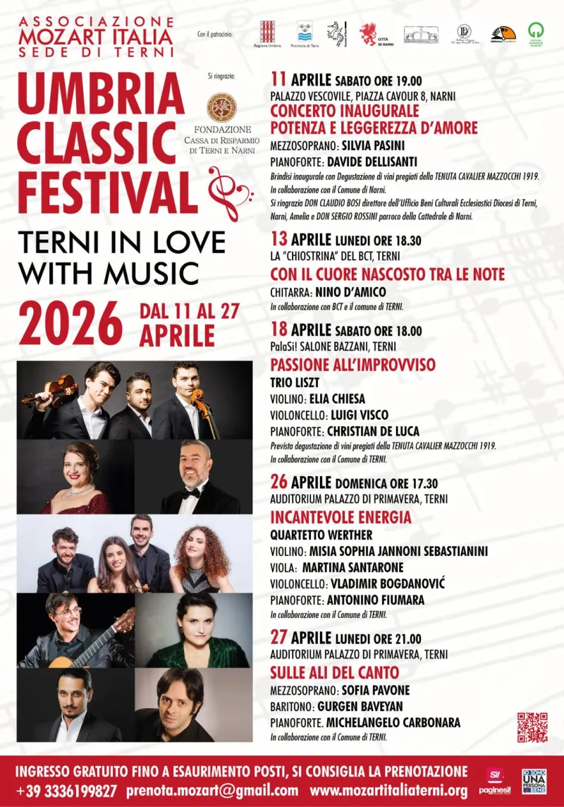 Grandi interpreti internazionali, location prestigiose e la magia della grande musica classica. Sono queste le caratteristiche di spicco dell'Umbria Classic Festival, un evento di riferimento per tutti gli estimatori e appassionati dell'ascolto più raffinato. In programma dall'11 al 27 aprile 2026, la kermesse è organizzata dall’Associazione Mozart Italia sede di Terni, con il sostegno della Fondazione Carit ed in collaborazione con i Comuni di Terni e Narni.