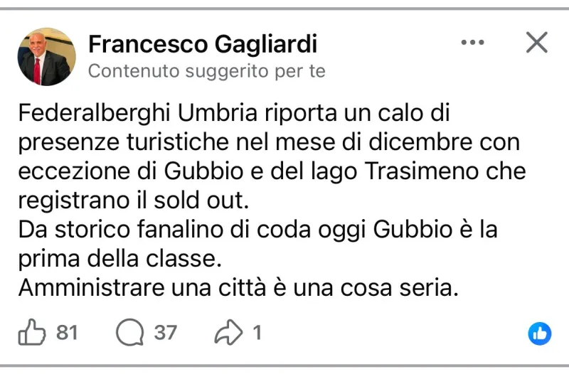 Secondo Federalberghi Umbria, il mese di dicembre ha registrato un calo generale delle presenze turistiche, con due eccezioni significative: Gubbio e il Trasimeno, che avrebbero fatto registrare il sold out. Un risultato che l’amministrazione accoglie come segnale incoraggiante e come prova della capacità della città di attrarre visitatori.