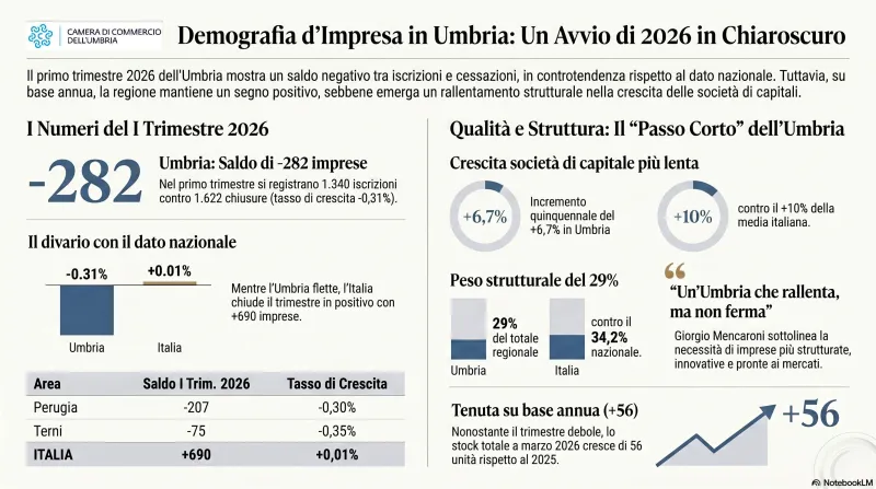L’Umbria aveva chiuso il 2025 con un modesto ma significativo segno più, 273 imprese in tasca in più, e il terzo trimestre aveva fatto sperare in un’accelerazione. Poi è arrivato l’inizio del 2026, e il conto è stato tutt’altro che indulgente: 282 imprese cancellate dal Registro delle imprese in soli tre mesi. Il dato – 1.340 iscrizioni contro 1.622 cessazioni – suona come una doccia fredda, resa ancora più gelida dal confronto con il resto del Paese. Mentre l’Italia, nello stesso periodo, ha messo a segno un saldo positivo di 690 nuove imprese (105.051 nate, 104.361 morte), l’Umbria arretra dello 0,31% contro il +0,01% nazionale. Un’inversione di tendenza che il presidente della Camera di Commercio dell’Umbria, Giorgio Mencaroni, invita a non drammatizzare ma nemmeno a sottovalutare: “Il dato del primo trimestre ci consegna un’Umbria che rallenta, ma non una regione ferma”.